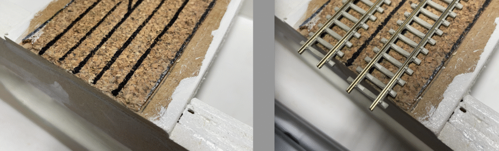 For at finde ud af hvor spor skal ligge, har jeg ved hjælp af en afstandsstyret lineal tegnet både en centerlinje og linjer for hver skinne i de to spor. En sort permanent marker kunne let tegne på den lagte kork.