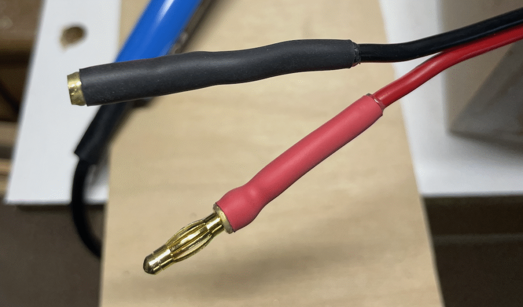 Jeg har derfor købt en tvillingledning i rød/sort 14 AWG som svare til 2,08 mm2, så jeg undgår at de bliver varme hvis der trækkes en stor strøm igennem disse. Bananstik har jeg valgt i kobber, da de er gode til at lede strømmen og lette at lode på. Efter monteringen har jeg anvendt en tyk krympeflex med indbygget lim så de beskyttes bedst muligt, og at man ikke får stød hvis de berøres.
