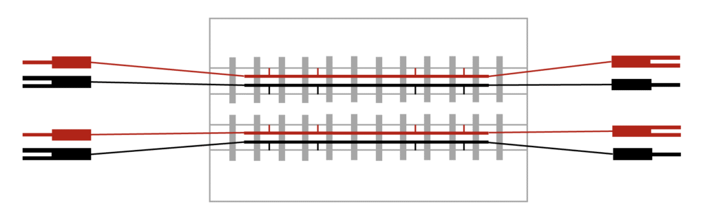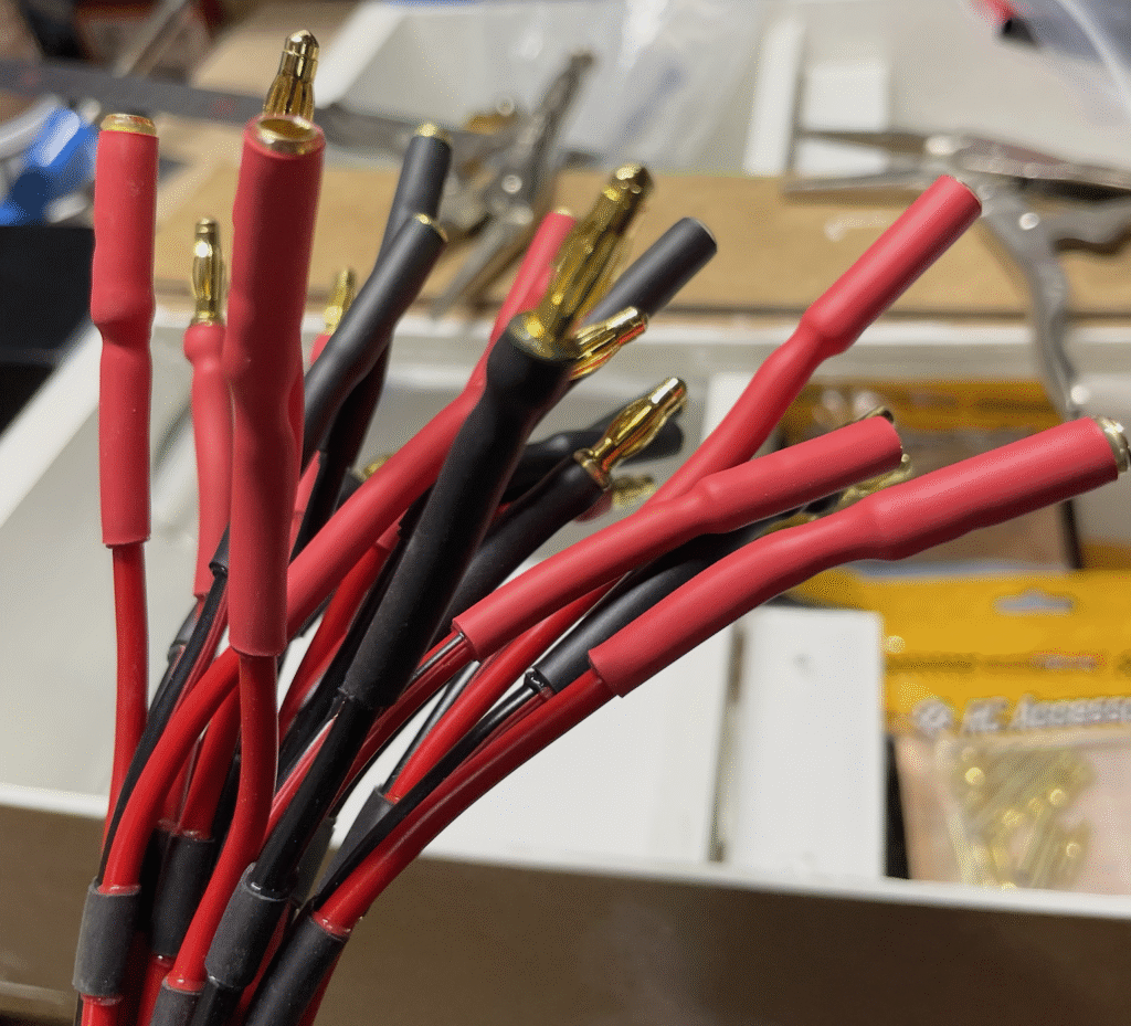 Så fik jeg loddet 24 bananstik, 12 tvillingledninger er nu samlet med han og hun 4mm bananstik – skiftevis rød/sort og sort/rød, nok til 3 moduler. Et stykke krympeflex sørger for at de forbliver tvillingledninger.