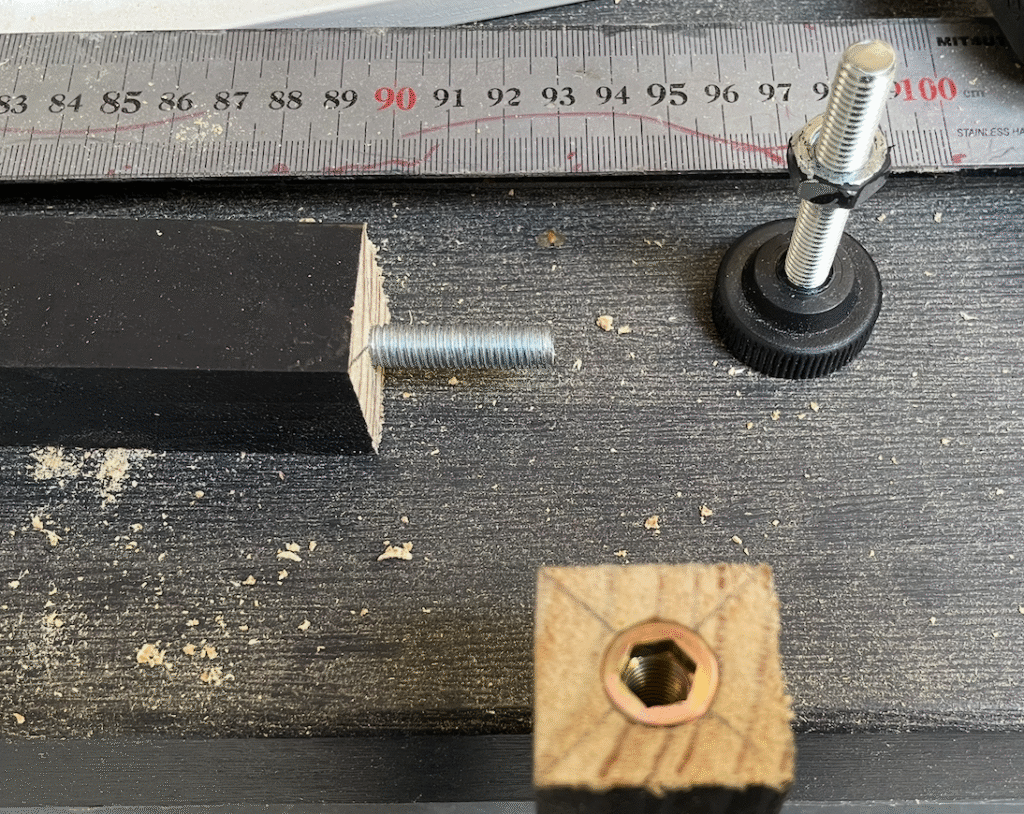 - Skrue den justerbare fod i det 300 mm stykke der blev skåret af, og så skrue dette i benet til en samlet højde på 1300 mm